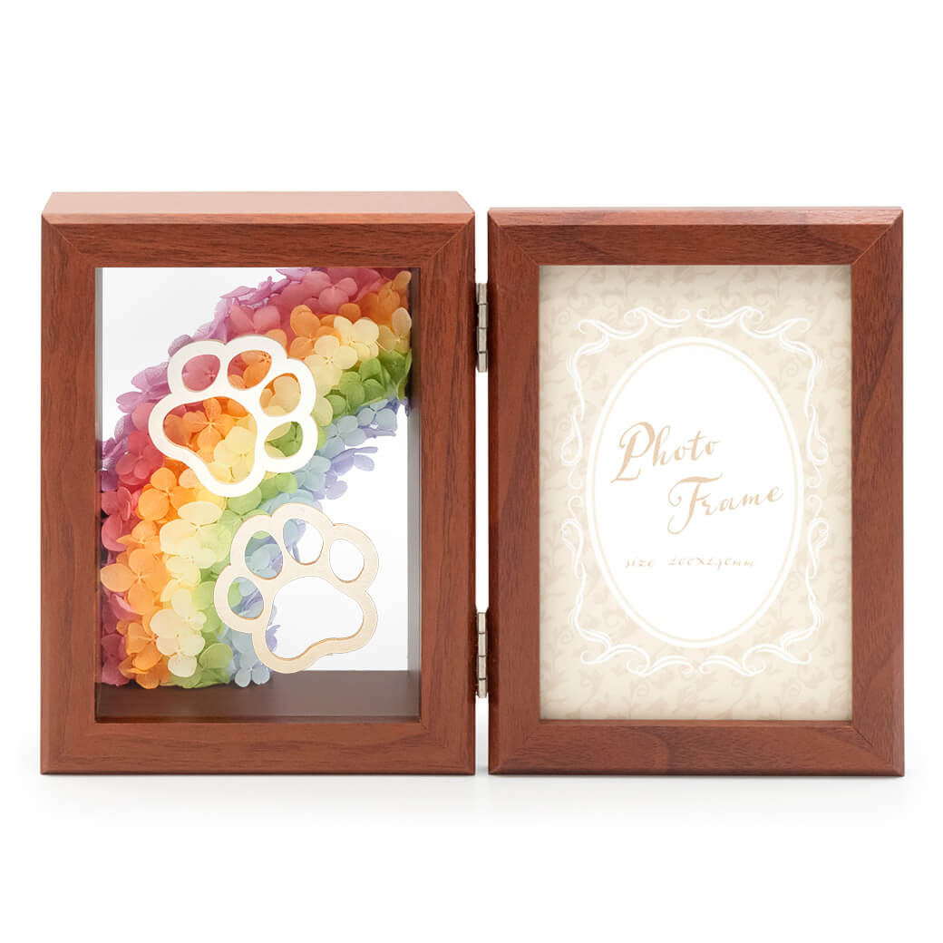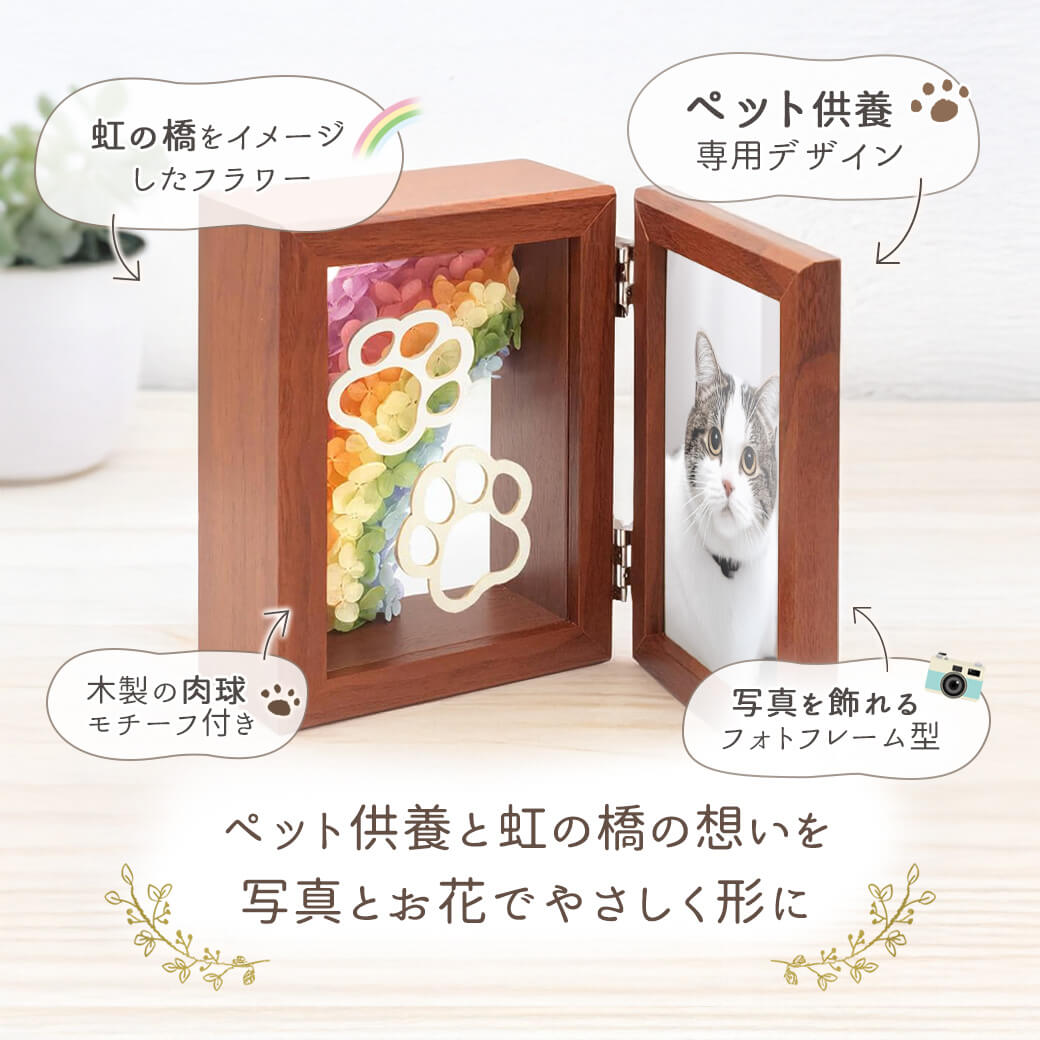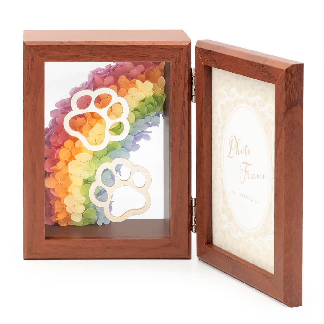 愛犬や愛猫などの大切な家族を亡くされた方へ、哀悼の気持ちを贈るペット供養用お供えプリザーブドフラワーです。温もりのある茶色のウッドフレームを使用し、右側には思い出の写真、左側にはプリザーブドフラワーのあじさいがあしらわれています。やさしく広がる虹色のフラワーは「虹の橋」の詩にあやかったデザイン。木製の肉球モチーフを2つ添え、元気に駆け出す姿をそっと想起させます。ペットロスの悲しみに寄り添い、「また会える日まで」という想いを込めた、心を励ますフラワーギフトです。
