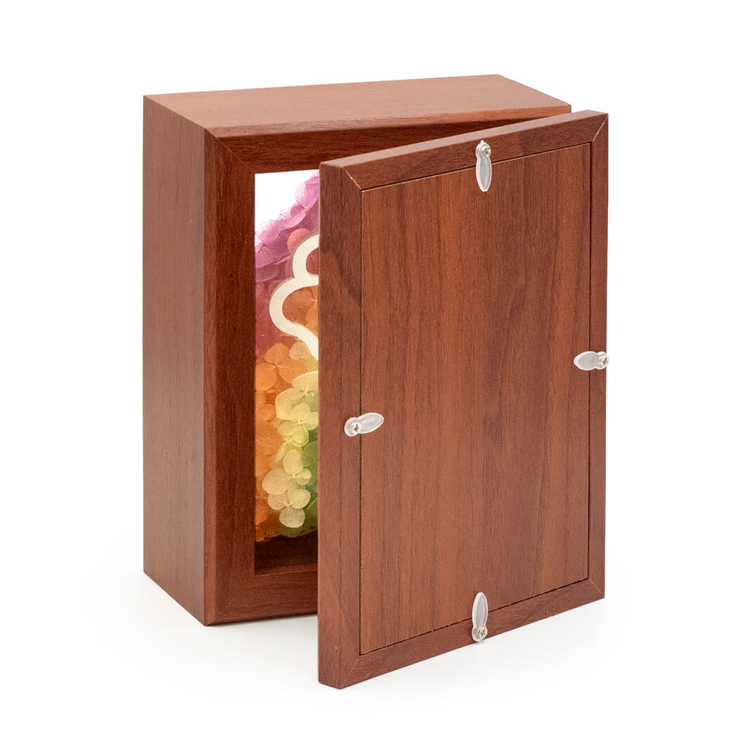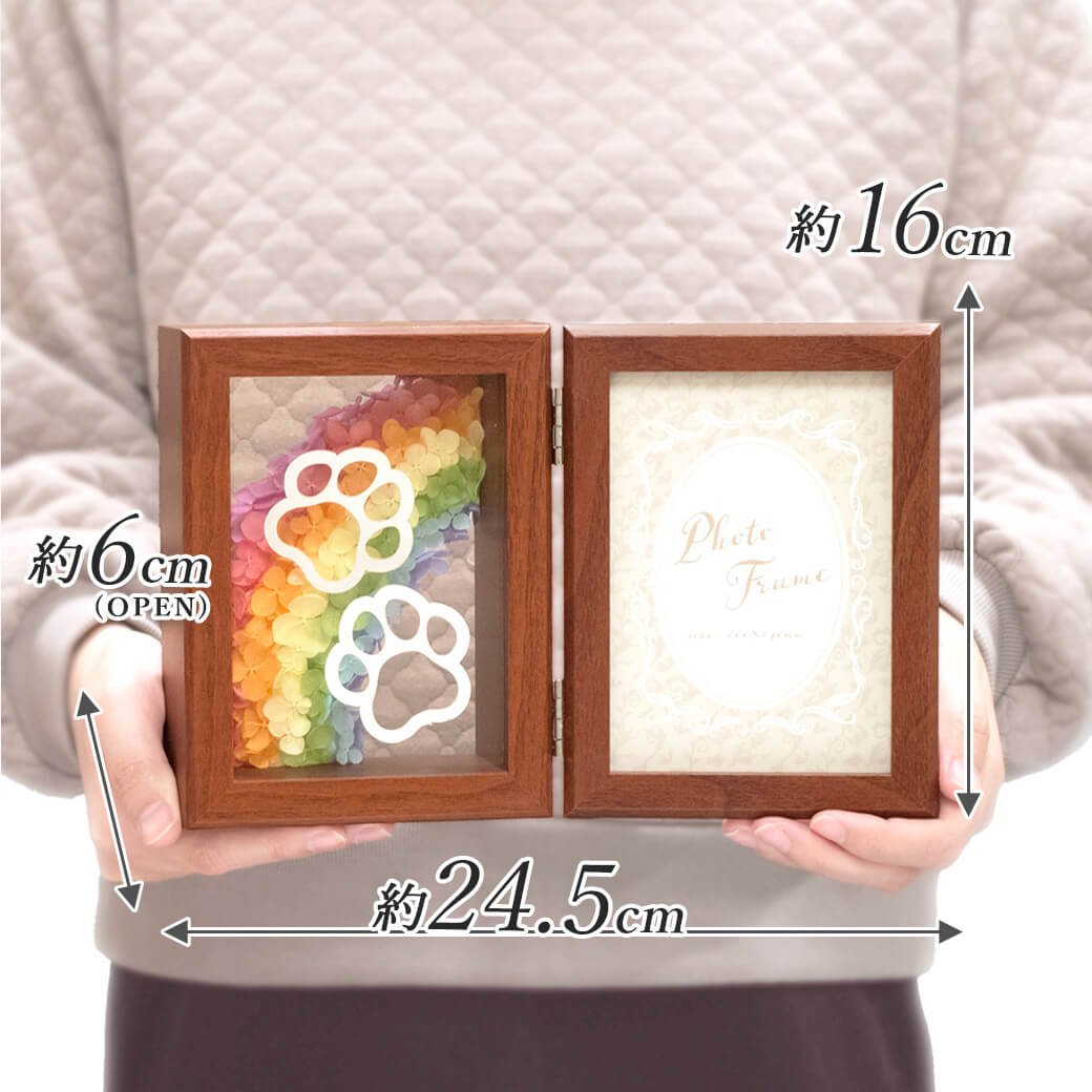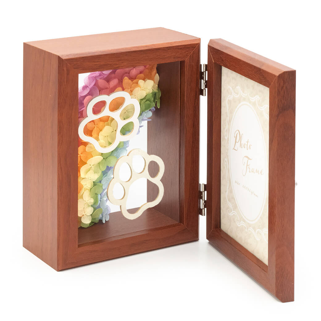 愛犬や愛猫などの大切な家族を亡くされた方へ、哀悼の気持ちを贈るペット供養用お供えプリザーブドフラワーです。温もりのある茶色のウッドフレームを使用し、右側には思い出の写真、左側にはプリザーブドフラワーのあじさいがあしらわれています。やさしく広がる虹色のフラワーは「虹の橋」の詩にあやかったデザイン。木製の肉球モチーフを2つ添え、元気に駆け出す姿をそっと想起させます。ペットロスの悲しみに寄り添い、「また会える日まで」という想いを込めた、心を励ますフラワーギフトです。