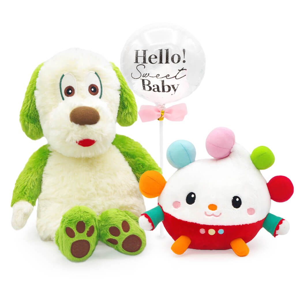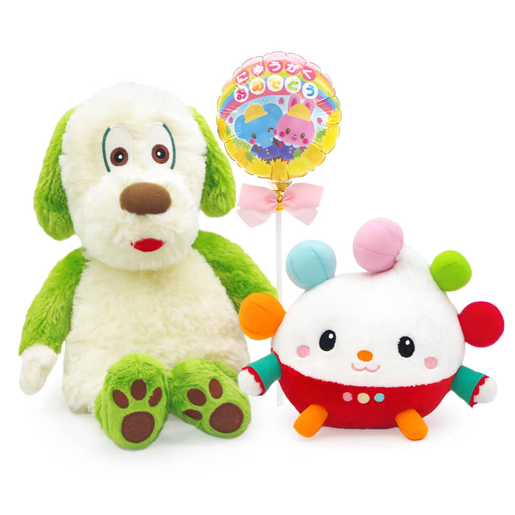 赤ちゃんや小さな子ども達に大人気のテレビ番組「いないいないばあっ!」に登場する人気キャラクター「ワンワン」と、新キャラクターの「ぽぅぽ」のぬいぐるみに、スティックバルーンがセットになった豪華なギフトです。