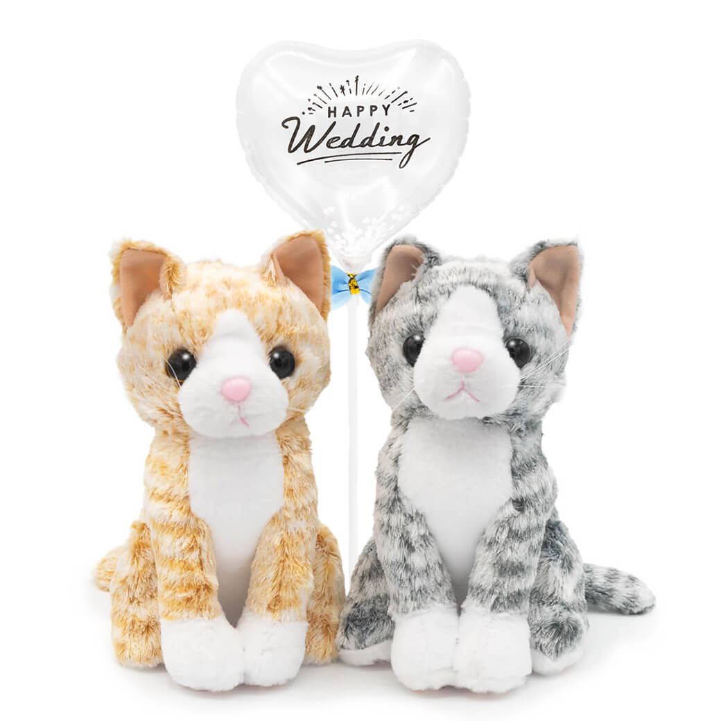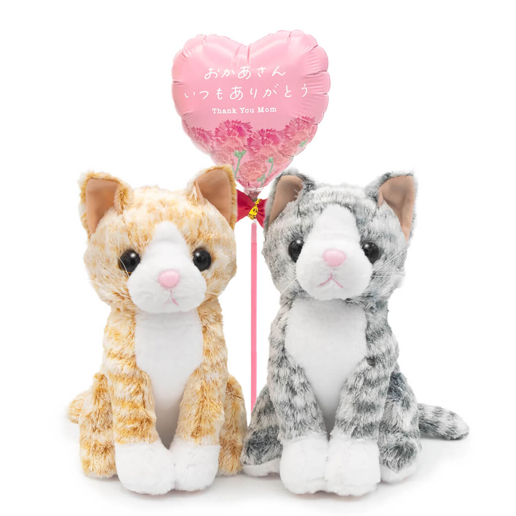 上質な猫のぬいぐるみ〈プレミアムキティ〉シリーズから、あたたかみのあるチャトラ猫とグレーの毛並みがリアルなサバトラ猫のペアに、スティックバルーンを合わせたギフトセットです。