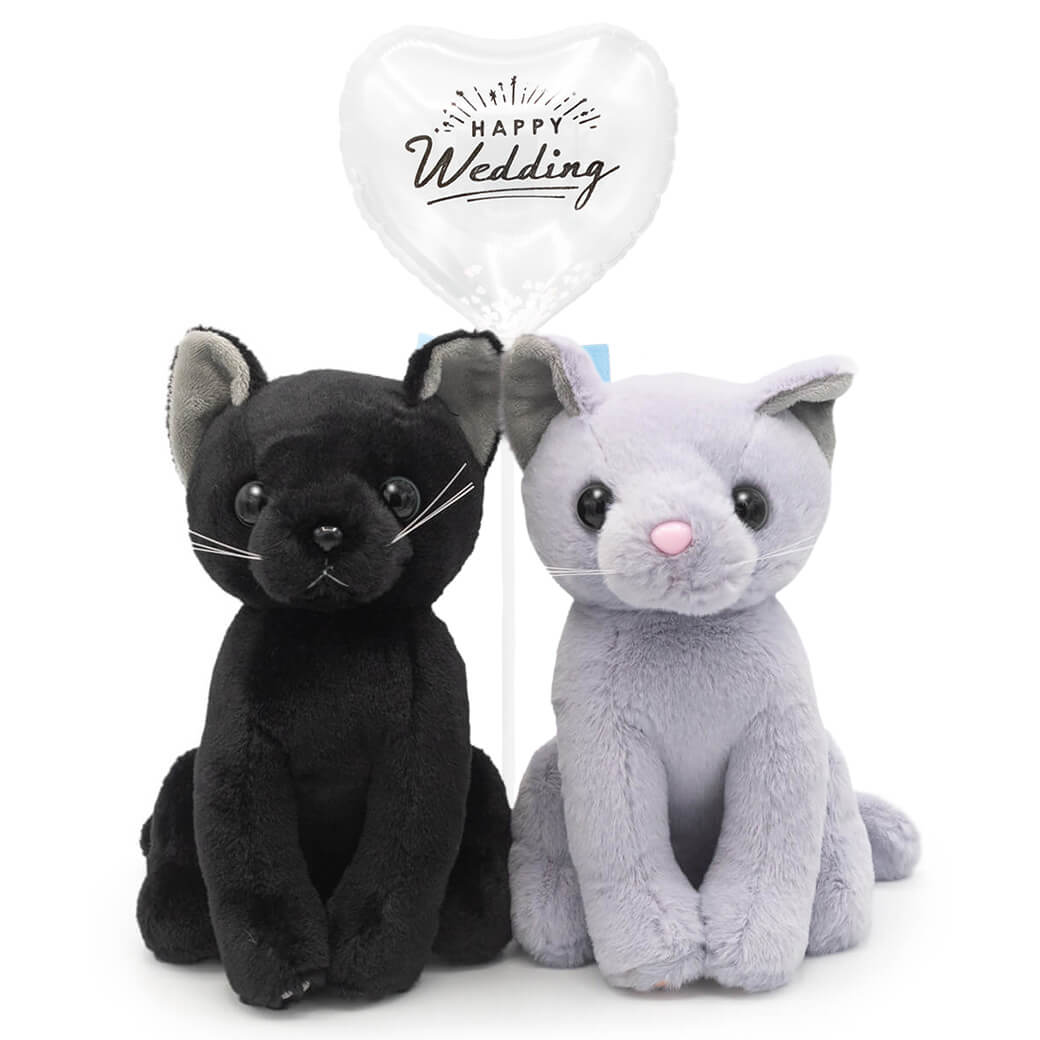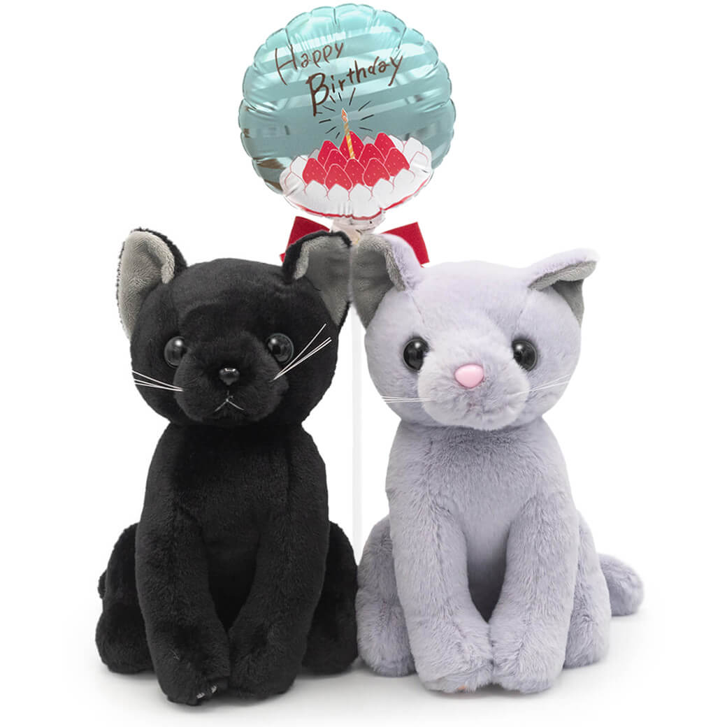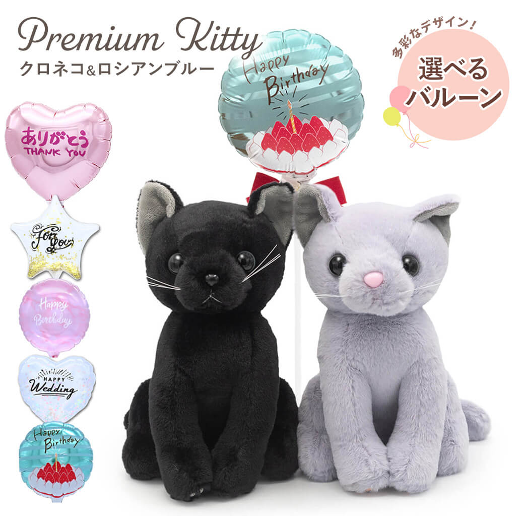 上質な猫のぬいぐるみ〈プレミアムキティ〉シリーズから、上品でシックなカラーが魅力の黒猫とロシアンブルーのペアに、スティックバルーンを合わせたギフトセットです。