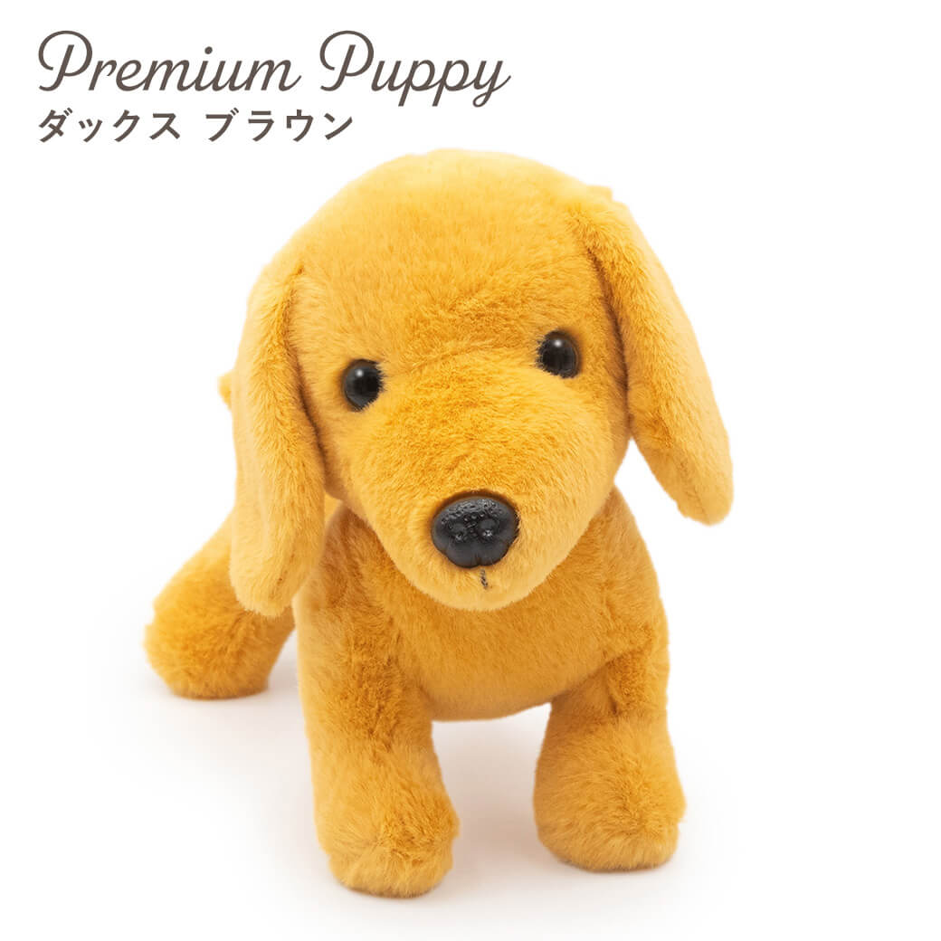 丁寧な仕上がりが魅力の〈プレミアムパピー〉シリーズから、ダックスフント(ブラウン)のぬいぐるみです。
