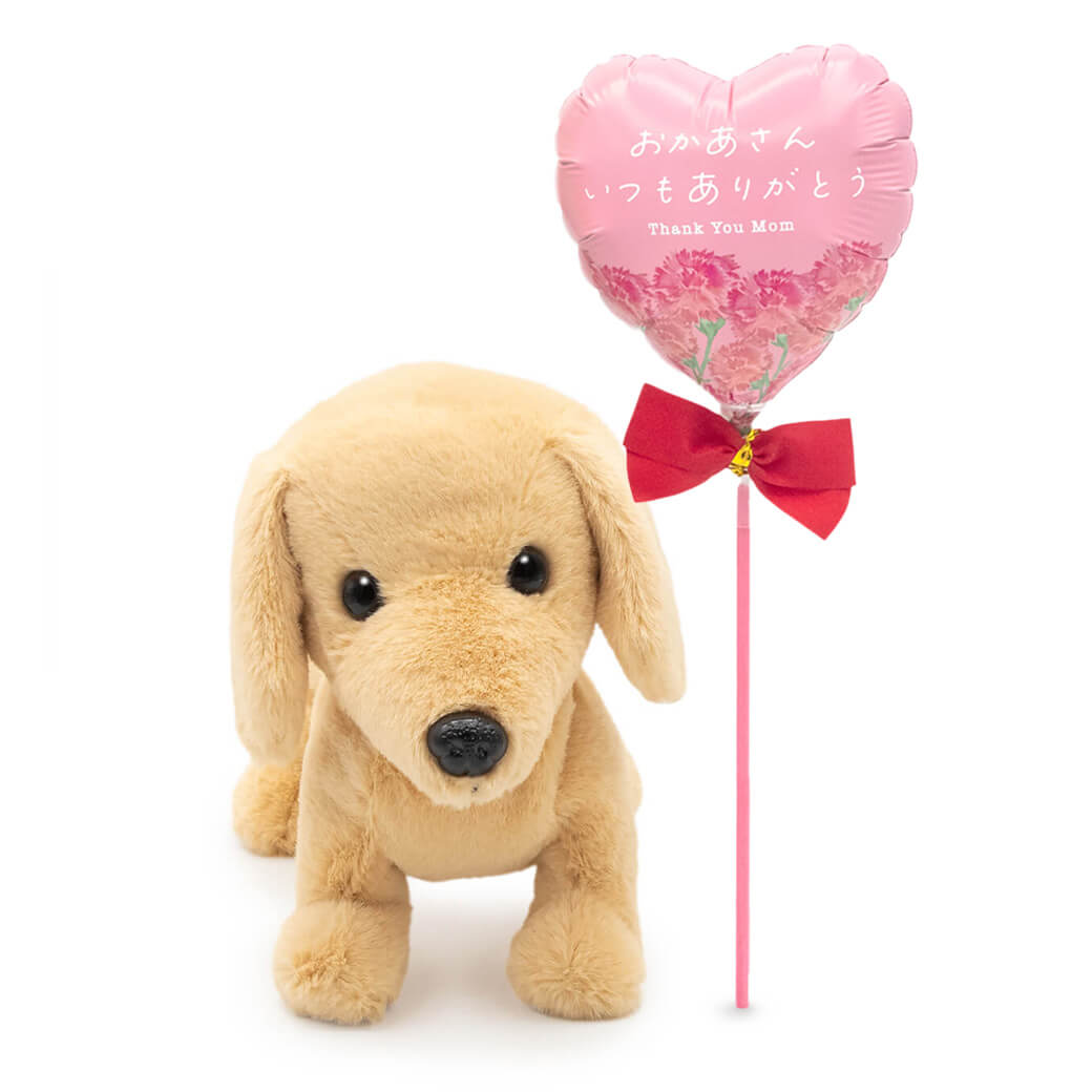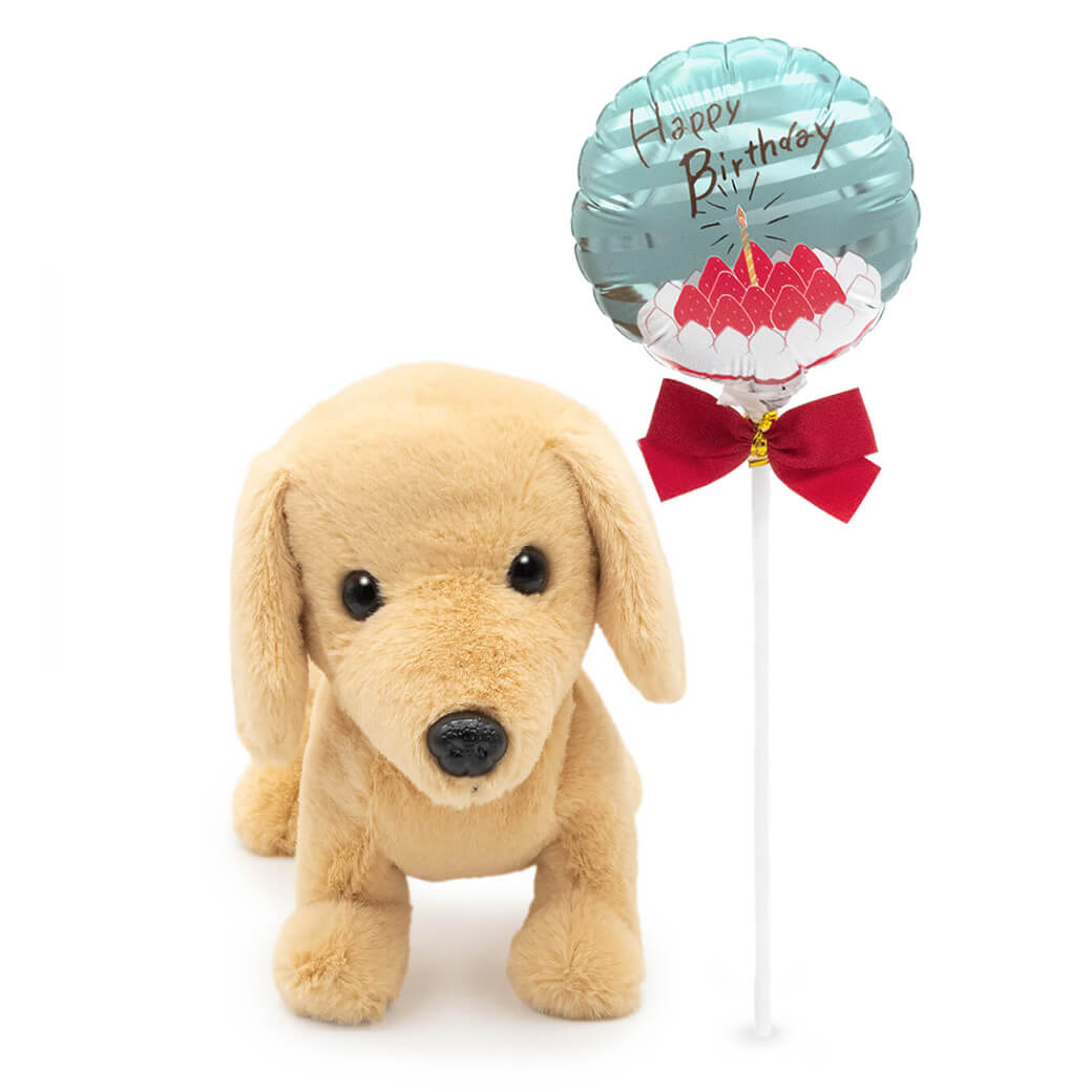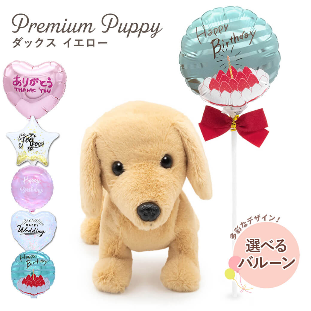 丁寧な仕上がりが魅力の〈プレミアムパピー〉シリーズから、ダックスフント(イエロー)のぬいぐるみと、スティックバルーンがセットになったギフトです。