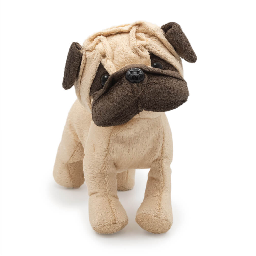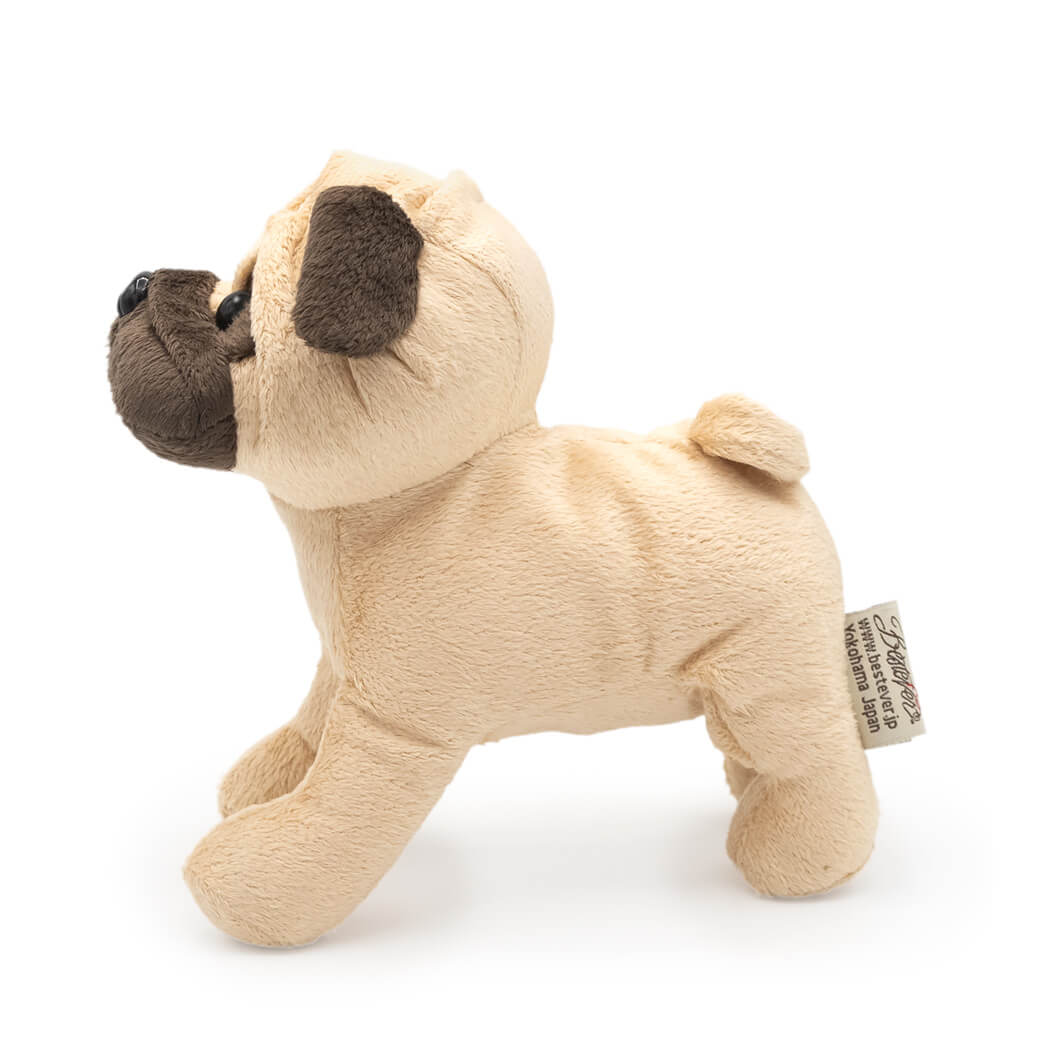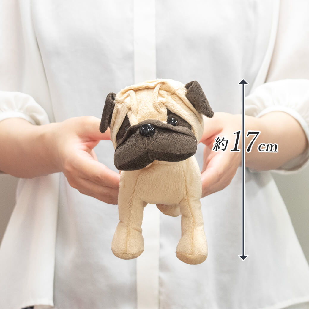 つやつやの毛並みやパグらしい愛嬌たっぷりの表情、こまやかなシワやなど細部までこだわって作られています。なめらかな手触りは本物のようで、そっと心を癒してくれます。