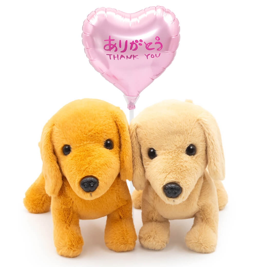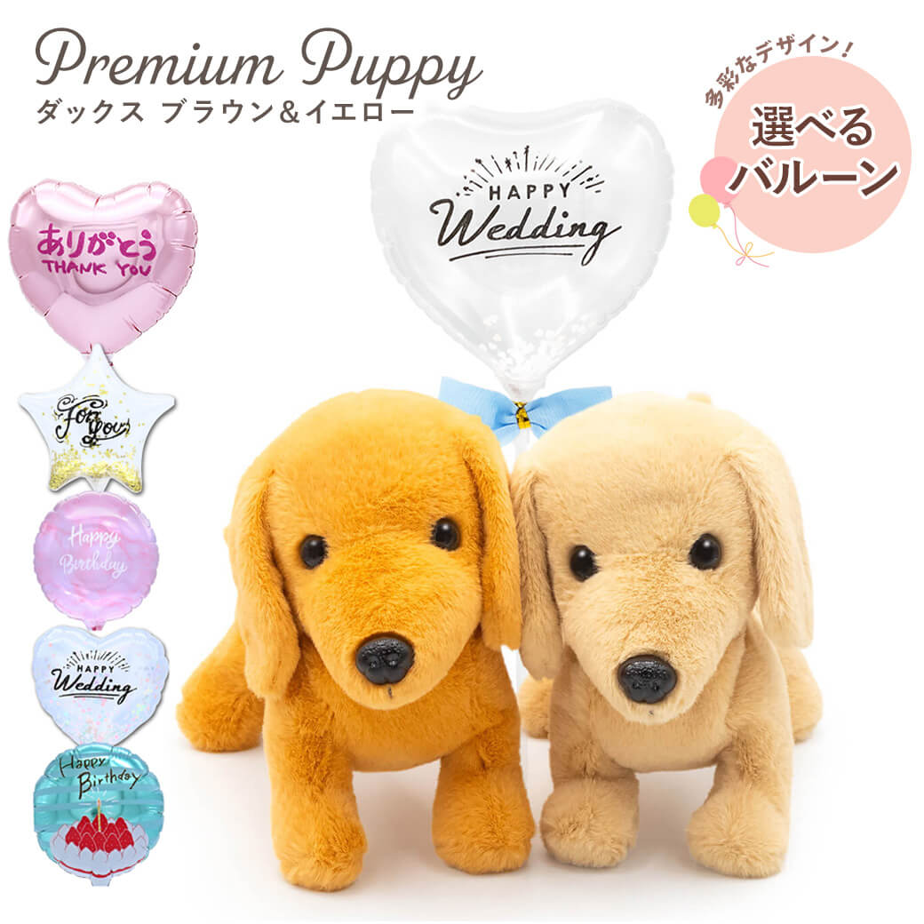丁寧な仕上がりが魅力のぬいぐるみ〈プレミアムパピー〉シリーズから、ダックスフントのブラウン&イエローのペアセットに、スティックバルーンがセットになったギフトです。ダックスの特徴的な長い胴体や、ぽてっとした足など細部までこだわって作られています。つぶらな瞳はまるで本物のようで、犬好きさんや、ペットと暮らす方へのプレゼントにぴったり♪