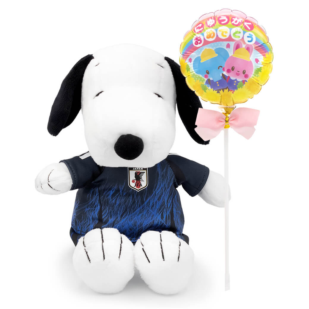 爽やか笑顔のスヌーピーがサッカー男子日本代表の新ユニフォームを着たぬいぐるみと、スティックバルーンがセットになったギフトです。