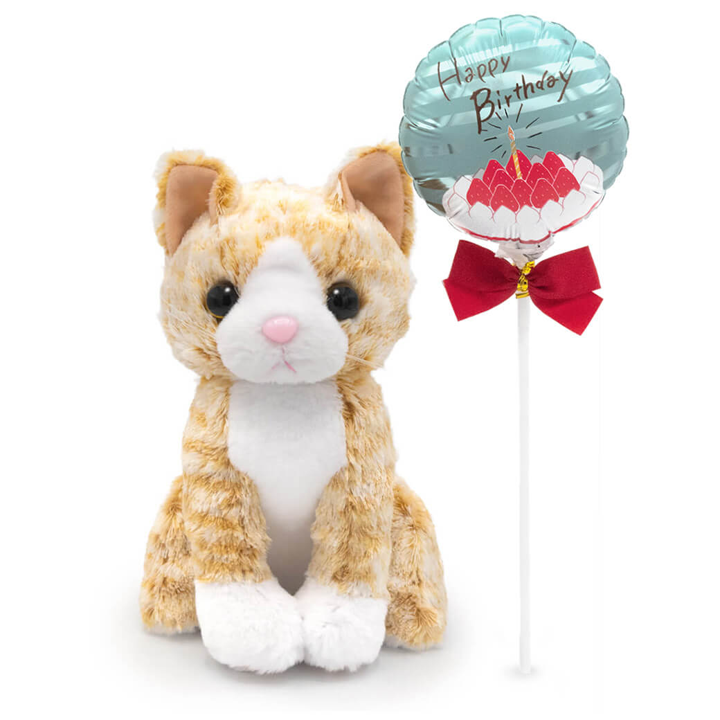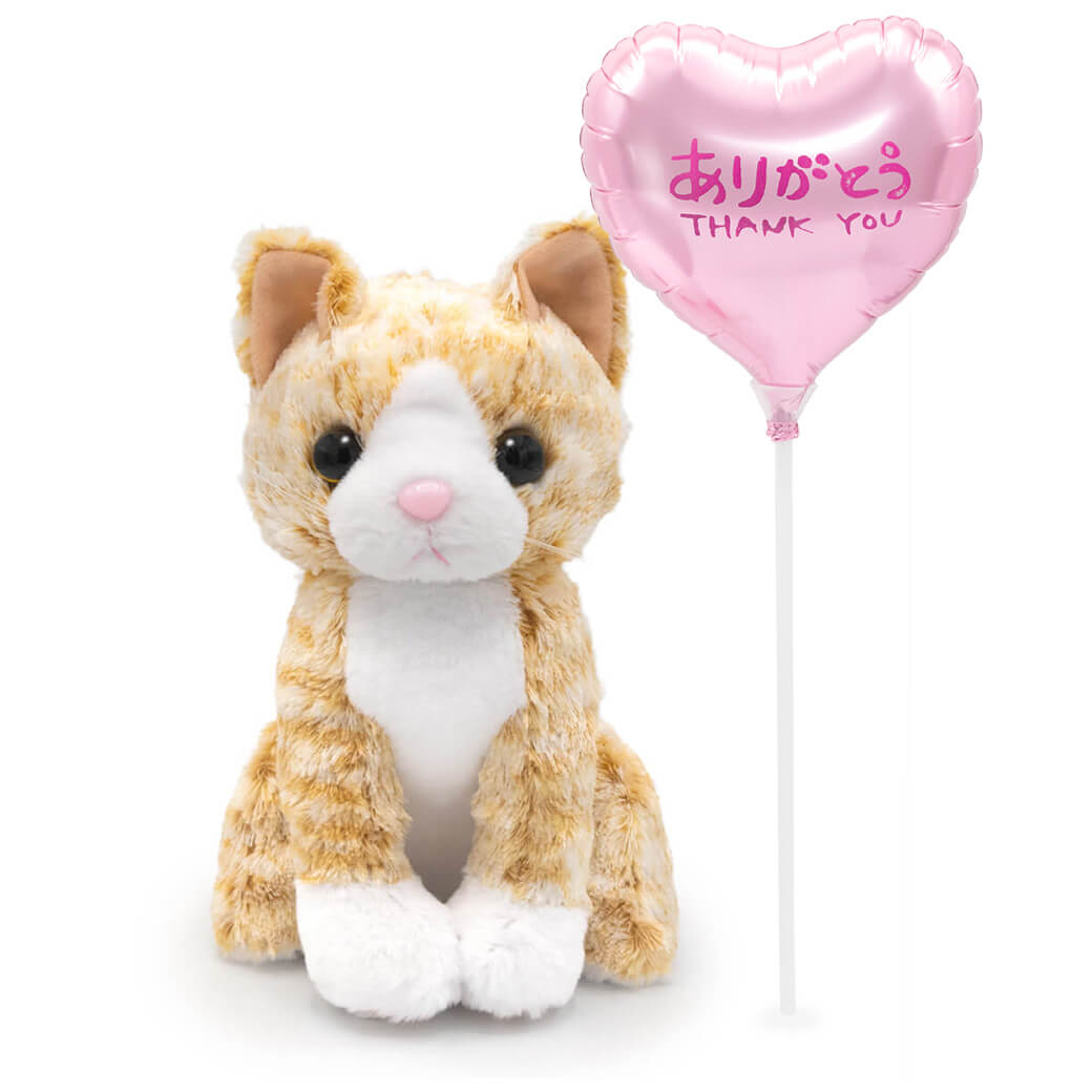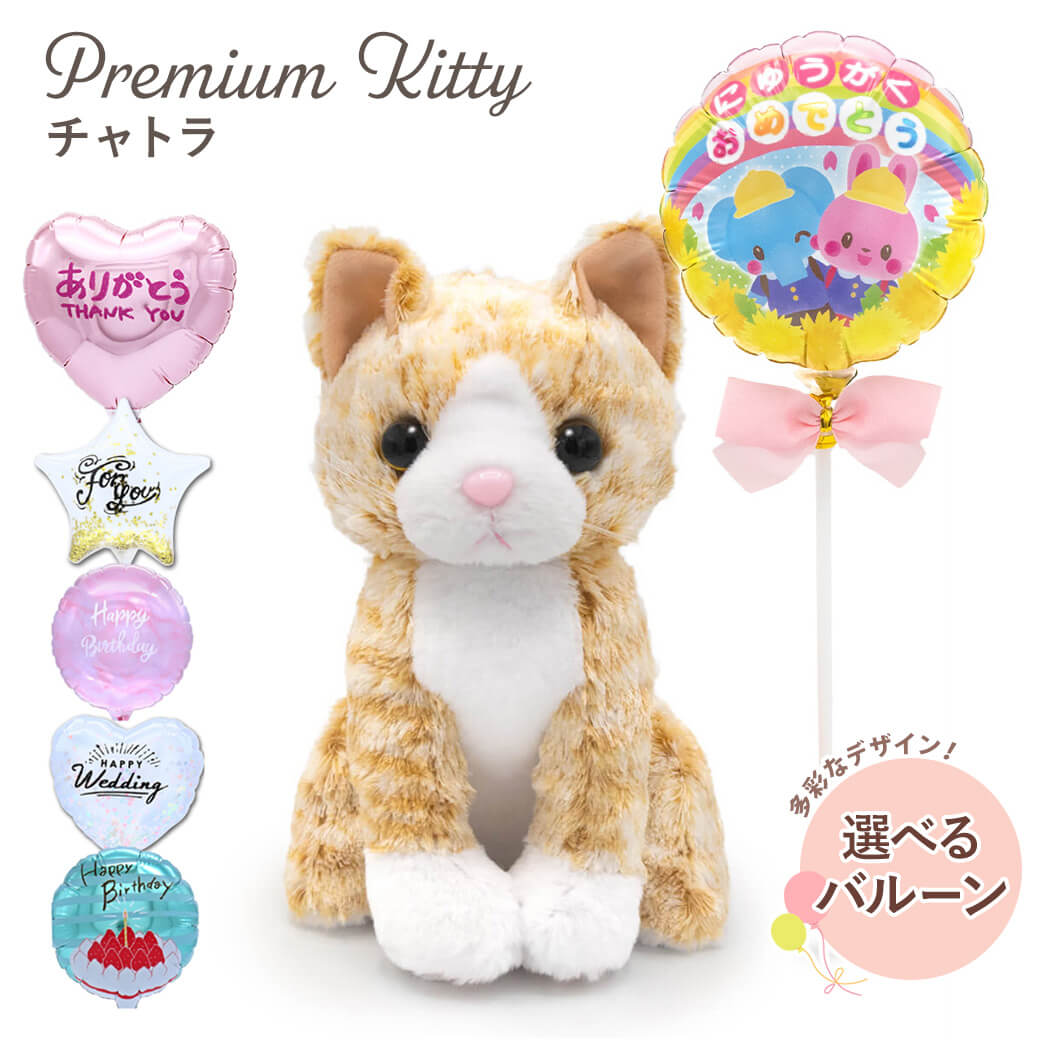 上質な猫のぬいぐるみ〈プレミアムキティ〉シリーズから、オレンジの毛並みがかわいいチャトラ猫のぬいぐるみと、スティックバルーンがセットになったギフトです。