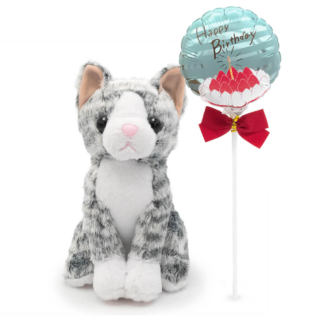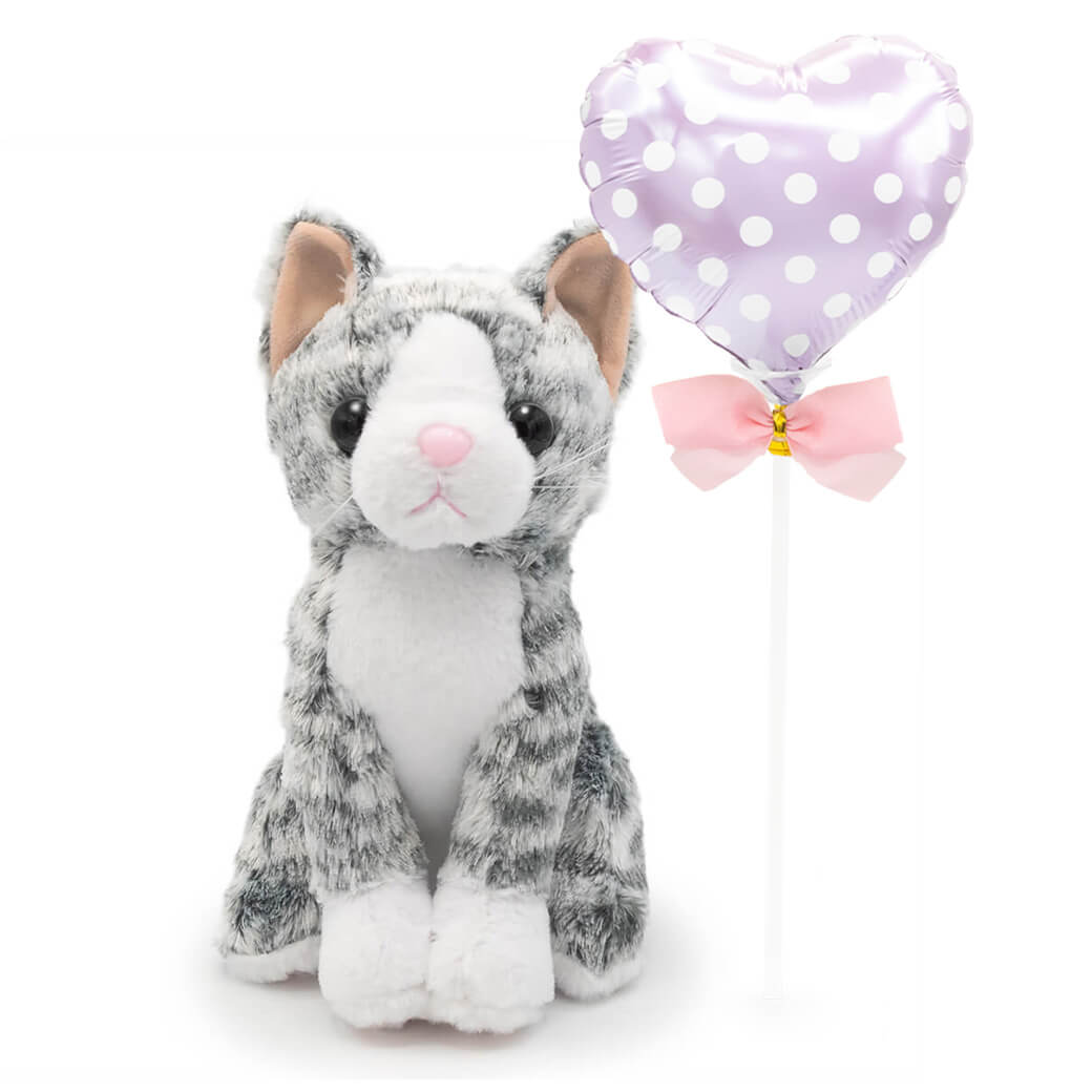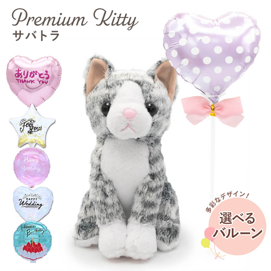 上質な猫のぬいぐるみ〈プレミアムキティ〉シリーズから、グレーの毛並みがおしゃれなサバトラ猫のぬいぐるみと、スティックバルーンがセットになったギフトです。