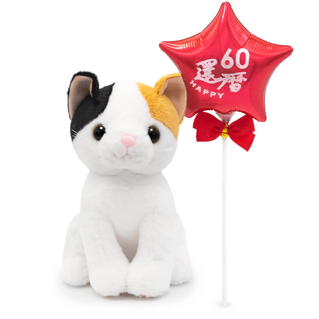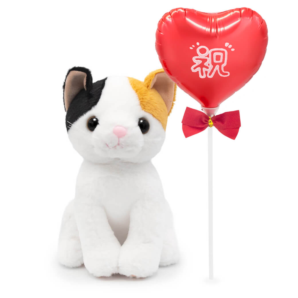 上質な猫のぬいぐるみ〈プレミアムキティ〉シリーズから、ユニークな模様がカワイイ三毛猫のぬいぐるみと、スティックバルーンがセットになったギフトです。