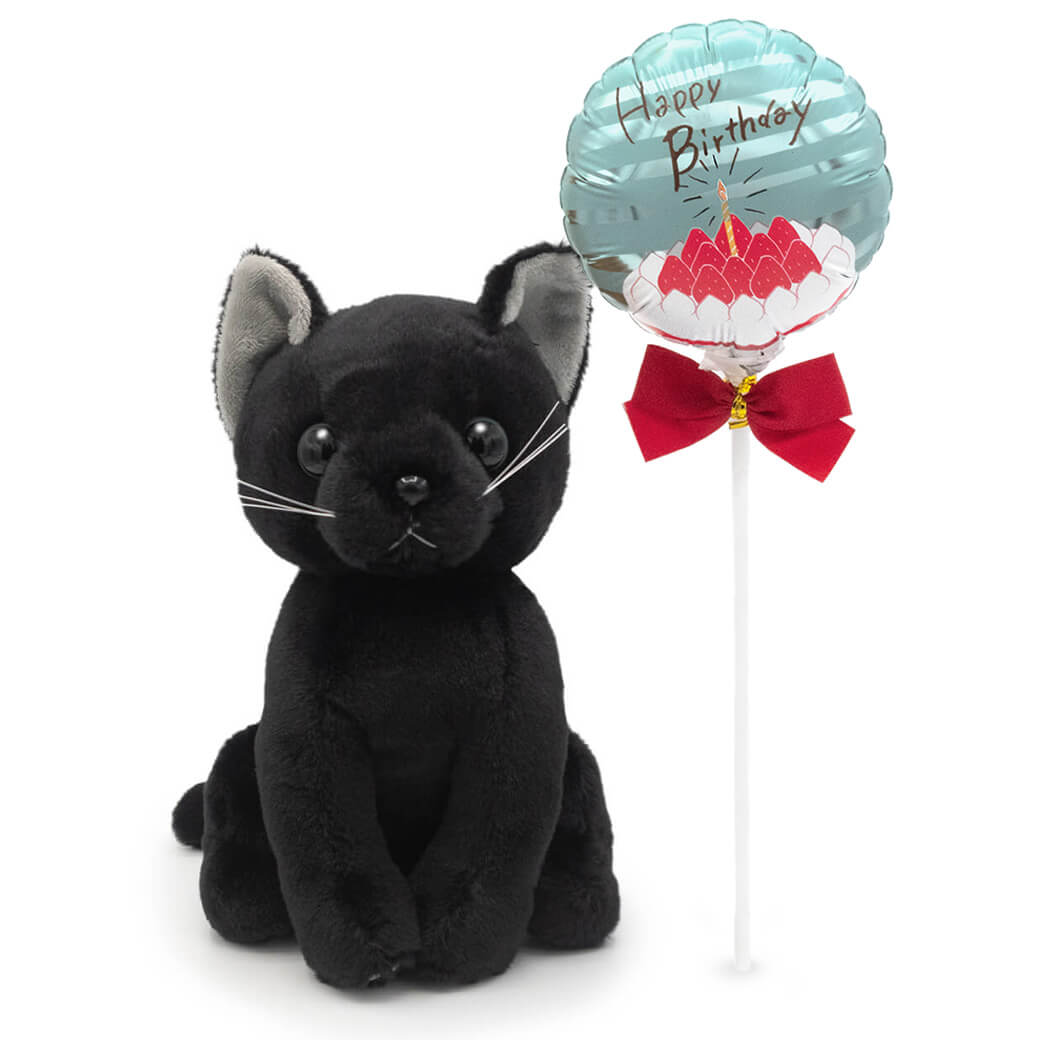 上質な猫のぬいぐるみ〈プレミアムキティ〉シリーズから、艶やかな毛並みが特長の黒猫のぬいぐるみと、スティックバルーンがセットになったギフトです。