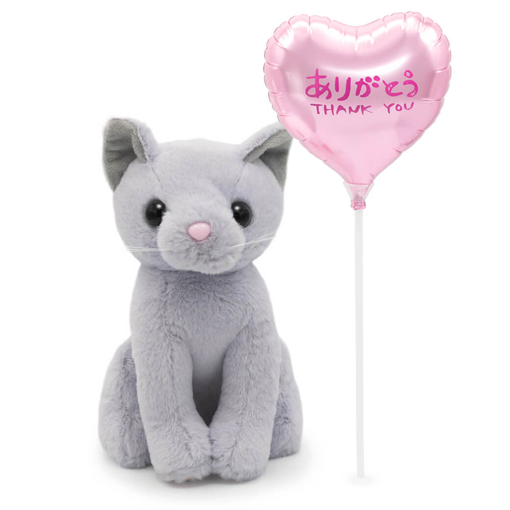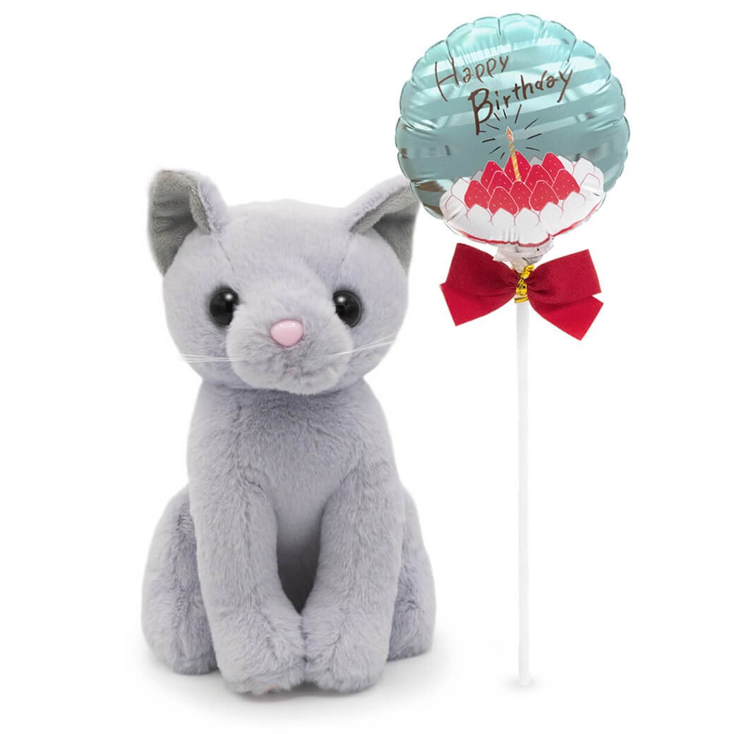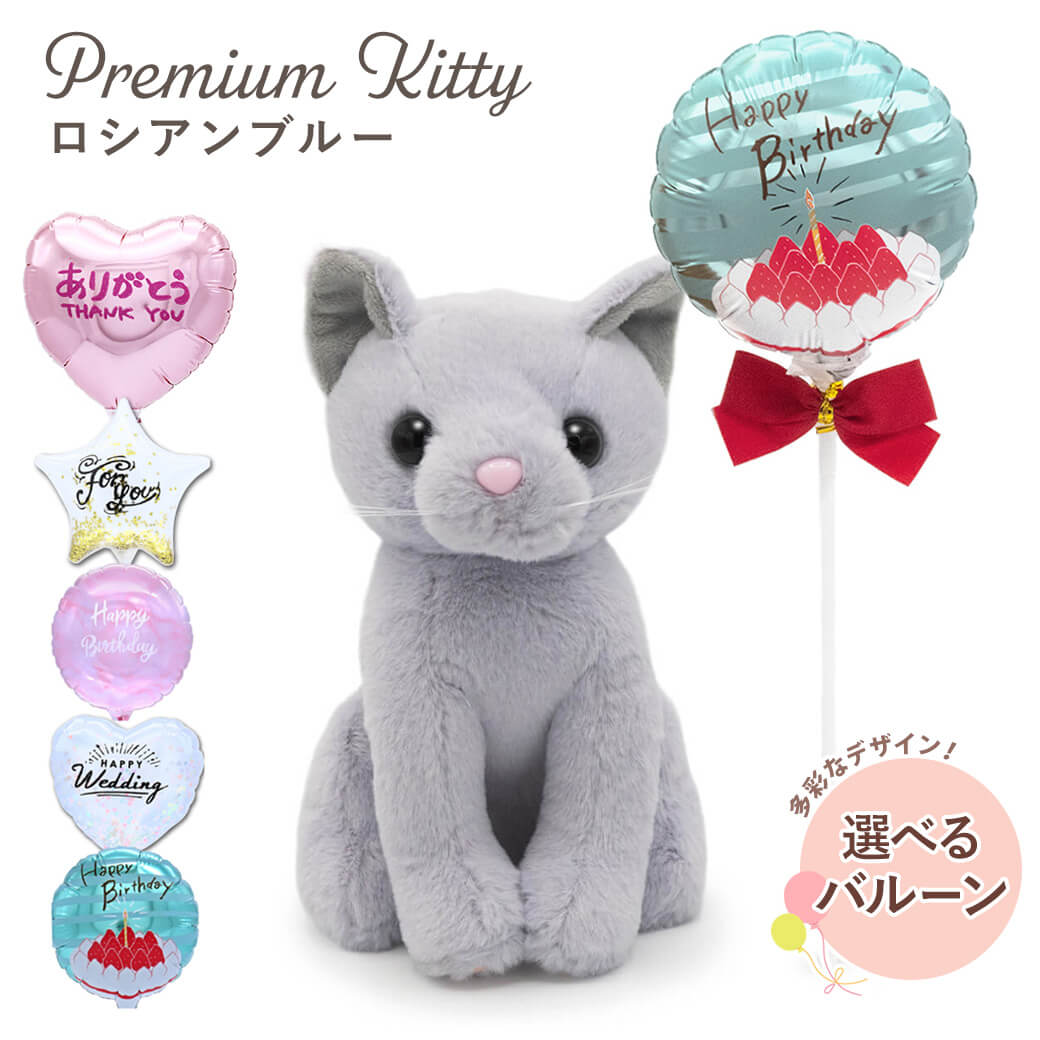 上質な猫のぬいぐるみ〈プレミアムキティ〉シリーズから、上品でかわいいロシアンブルーのぬいぐるみと、スティックバルーンがセットになったギフトです。