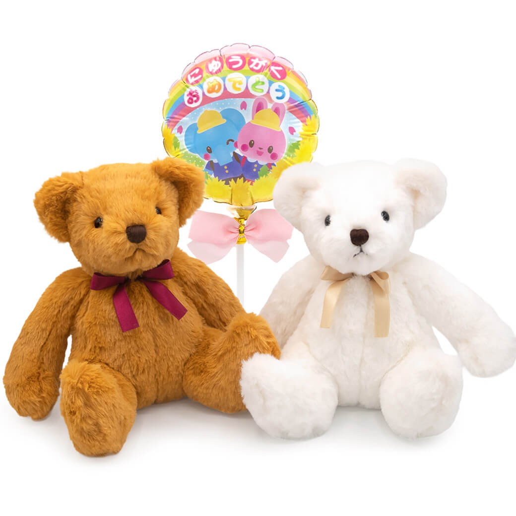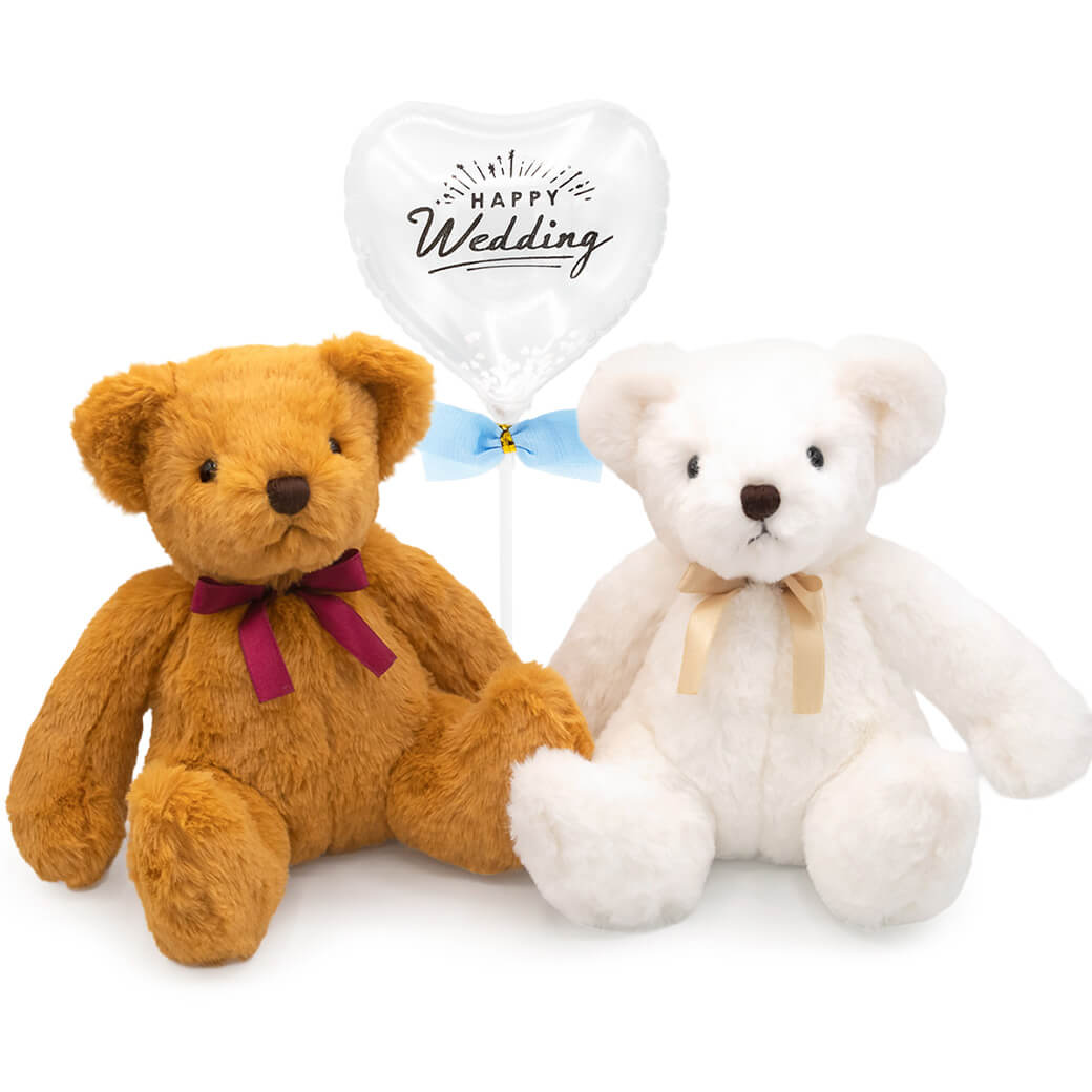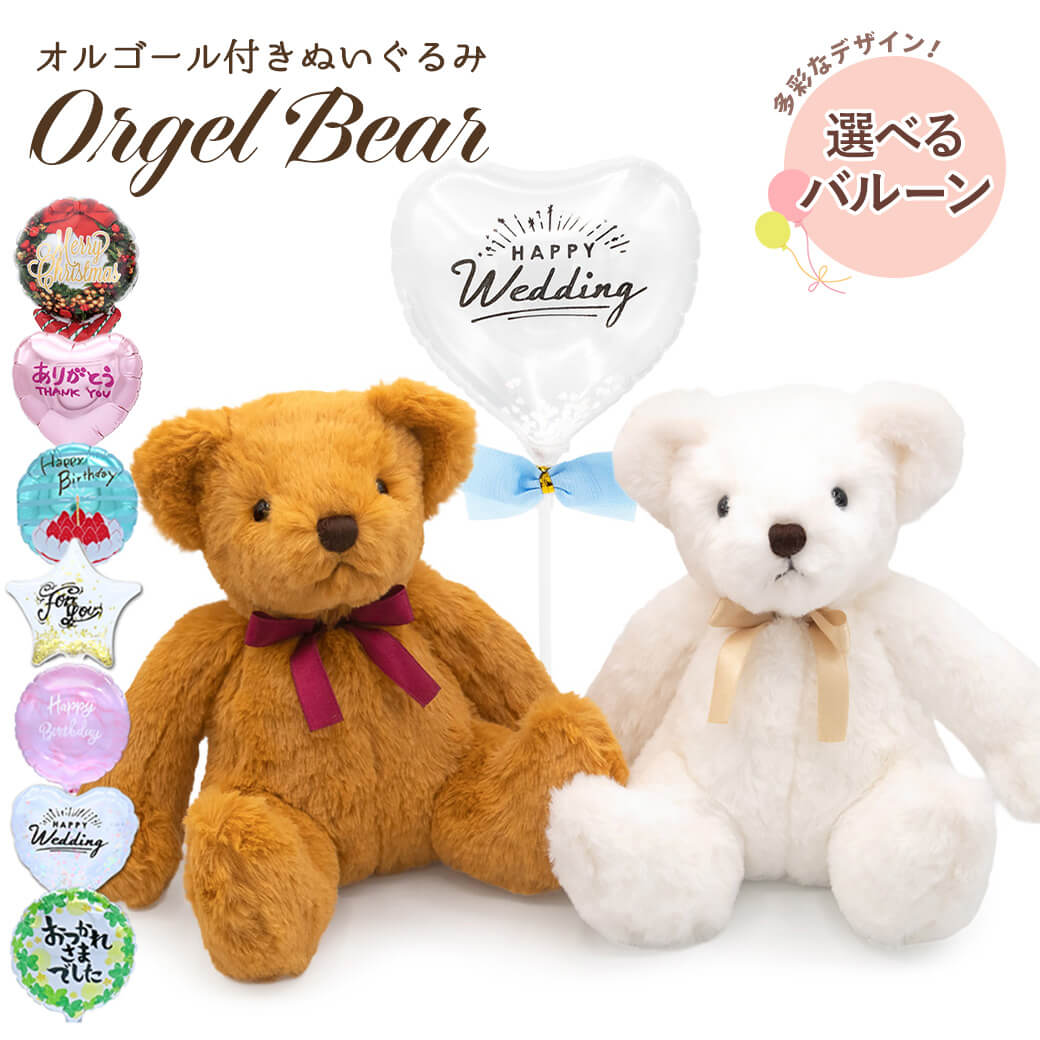 素朴でかわいいテディベアとオルゴールが一体型になったぬいぐるみと、スティックバルーンがセットになったペアギフトです。ゴールドブラウンとホワイトの毛並みは温かでふわふわな手ざわり♪