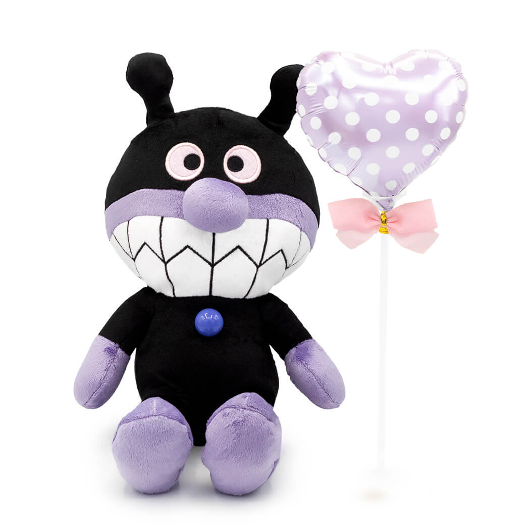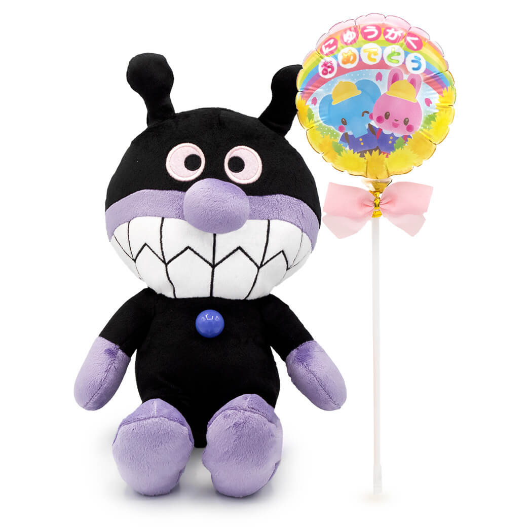 アニメ・絵本で大人気「アンパンマン」シリーズに登場する、アンパンマンの宿命のライバル、ばいきんまんのぬいぐるみと、スティックバルーンがセットになったギフトです。