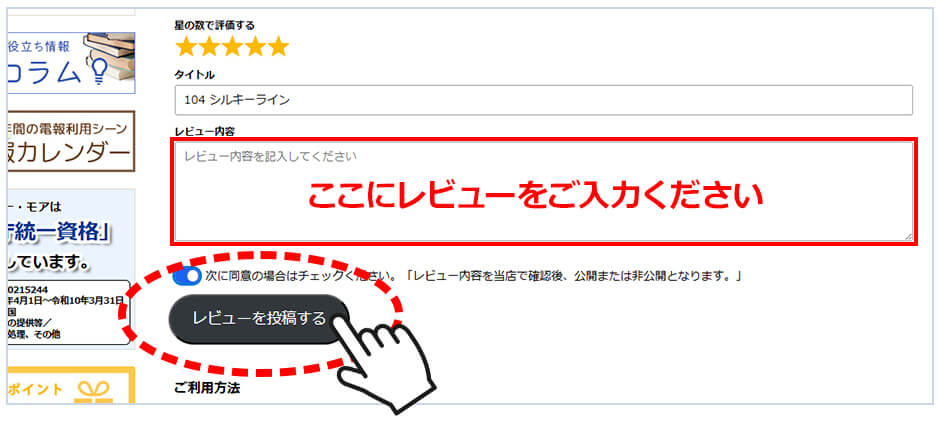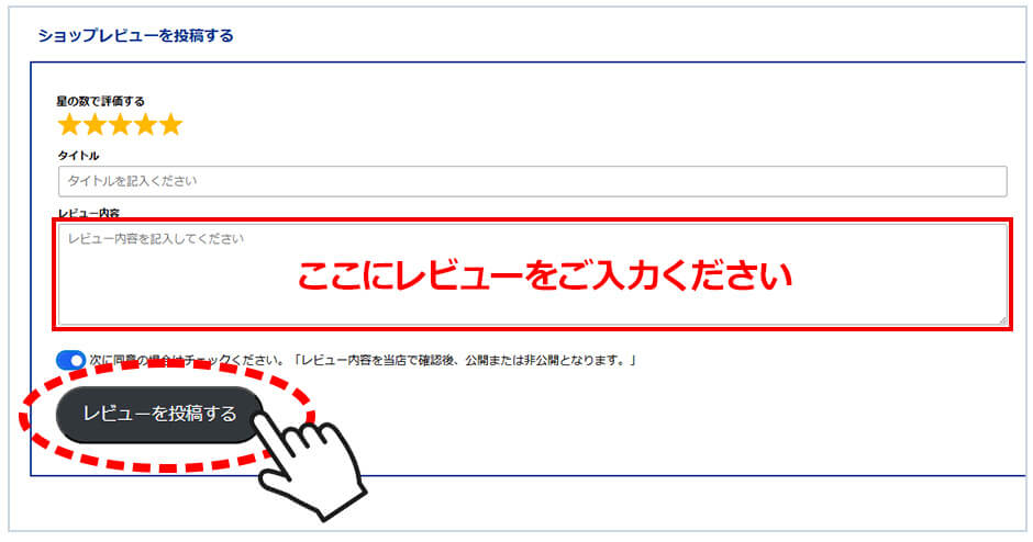 をご入力いただき、「レビューを投稿する」のボタンをクリックしてください。