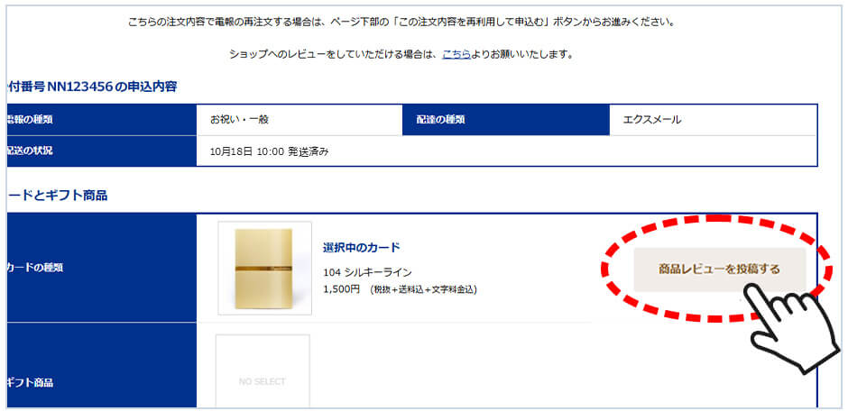 レビューを投稿する電報台紙、またはギフト商品の欄にある「商品レビューを投稿する」をクリックしてください。