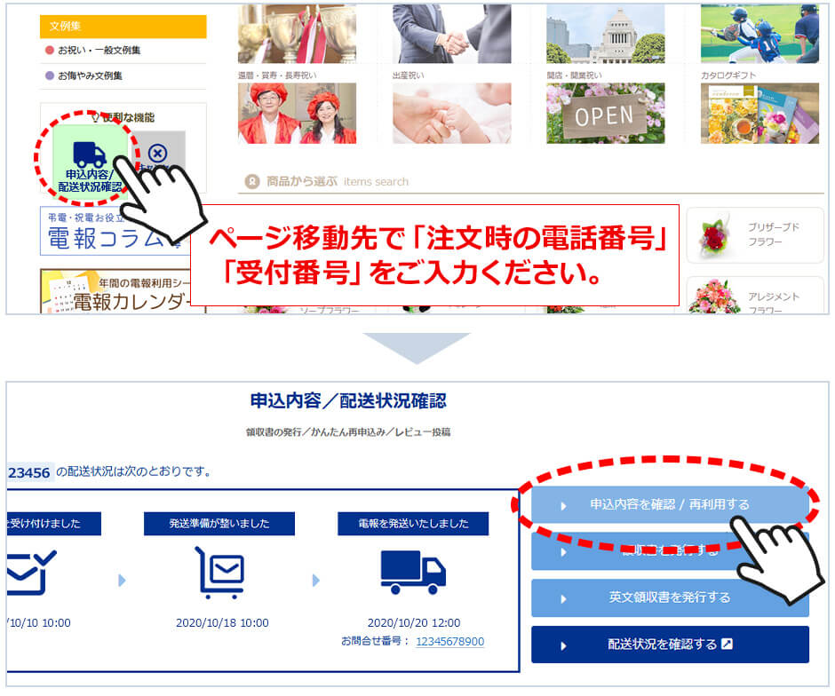 サイドメニューの「便利な機能」→「申込内容/配達状況確認」から、該当の受付番号・ご注文時の電話番号を入力してください。