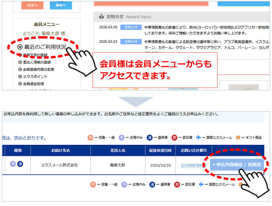 会員様は、サイドメニューの「会員メニュー」→「最近のご利用状況」からもごアクセスいただけます。