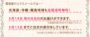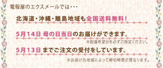 全国送料無料!5月14日、母の日当日のお届けが可能で5月13日までご注文を受付しています。※お届け先地域で締切時間は異なります。